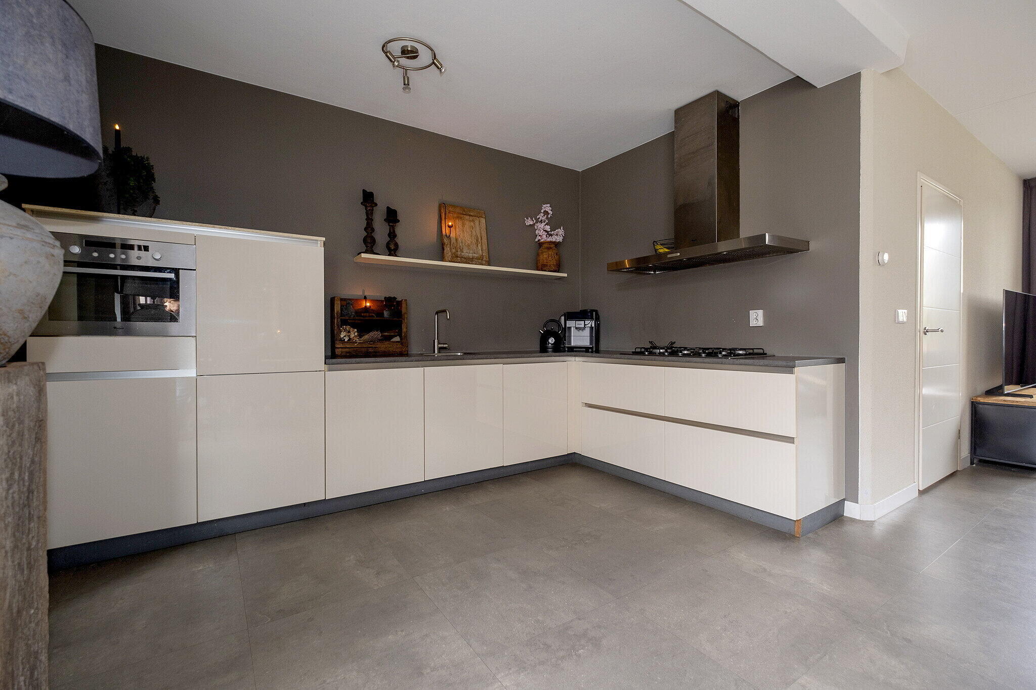 Entree/hal met meterkast, toilet, kelderkast en trapopgang. De ruime woonkamer (ca. 32 m²) heeft voldoende lichtinval en een sfeervolle houtkachel op een centrale plek in de kamer. De half-open keuken (ca. 10 m²) is voorzien van diverse inbouwapparatuur zoals o.a. 5-pits kookplaat, afzuigkap, vaatwasser (uit 2025), koelkast en combi-magnetron. Aansluitend de bijkeuken (ca. 5 m²) voor extra bergruimte en een loopdeur naar de tuin.