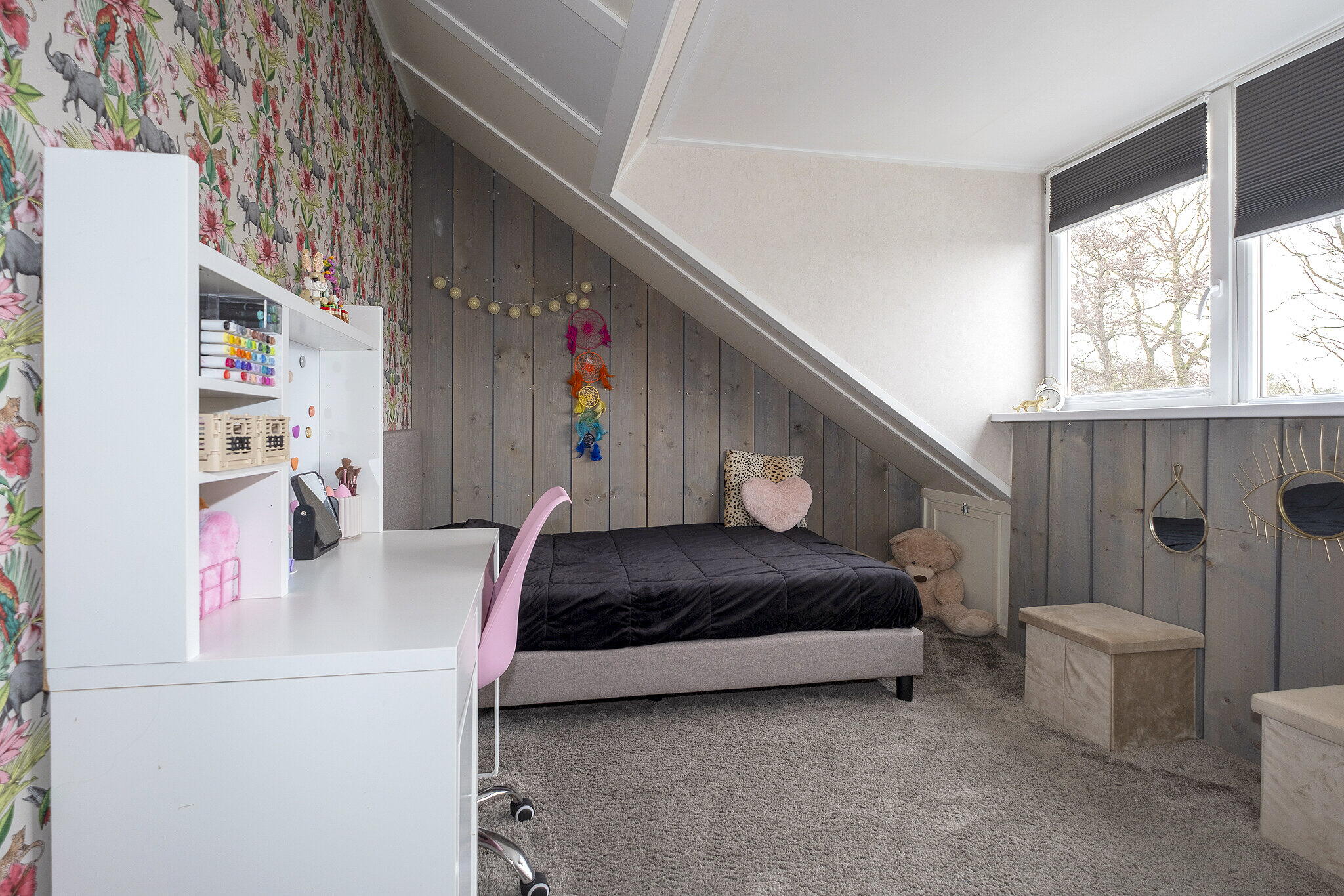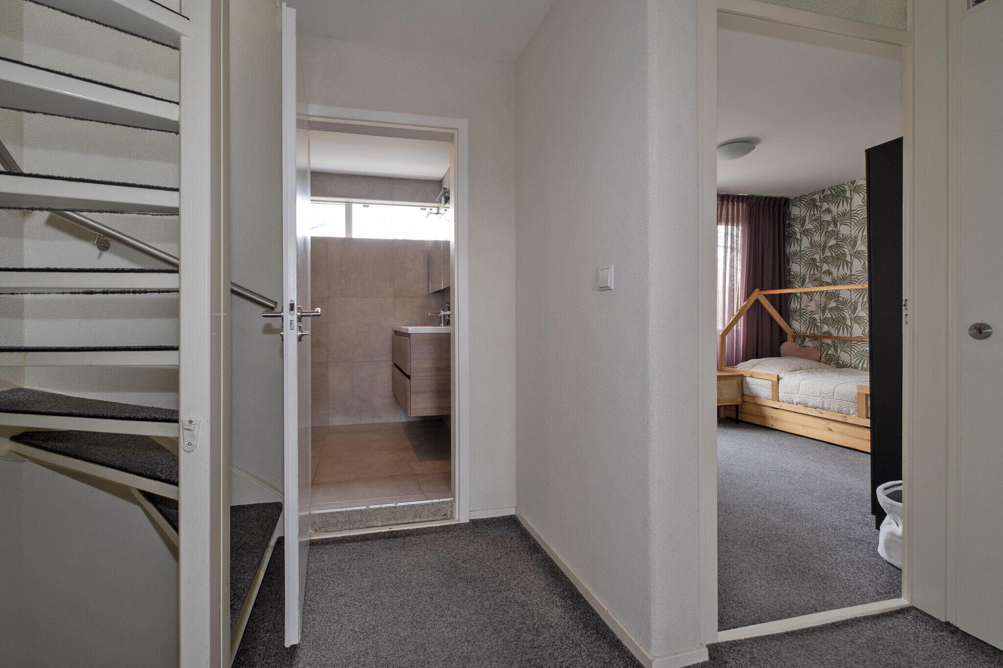 Op de eerste verdieping vindt u een overloop met toegang tot drie slaapkamers (ca. 15 m², ca. 12 m² en ca. 9 m²), vaste kast en de badkamer (vernieuwd in 2021). De moderne badkamer is uitgevoerd met inloopdouche, dubbele wastafel met meubel, designradiator en tweede toilet. Alle slaapkamers op deze verdieping zijn uitgerust met rolluiken.
