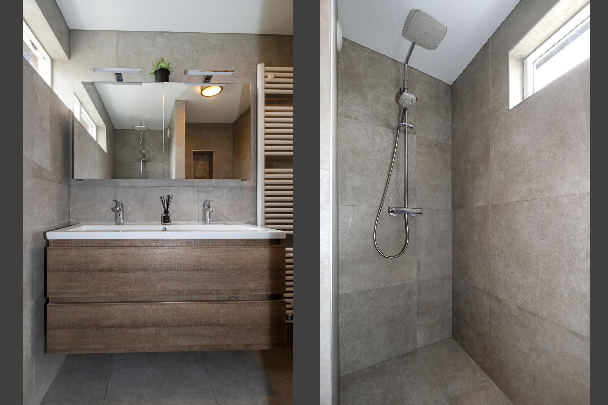 - Toilet, dubbele wastafel, wastafelmeubel, inloopdouche